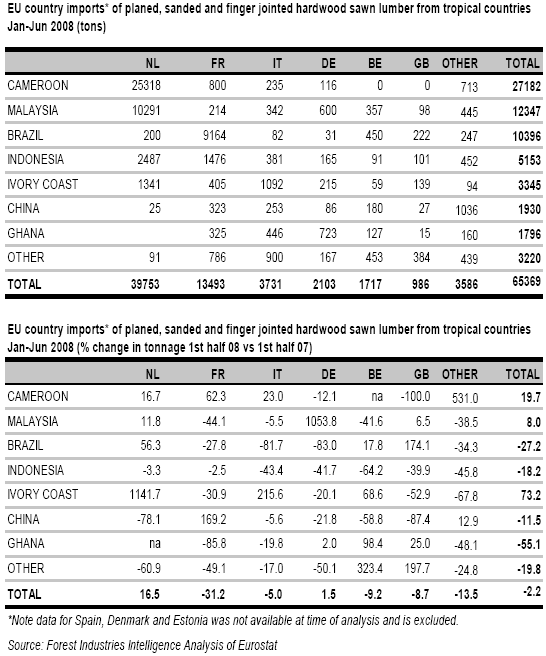EU imports from tropical countries of planed, sanded and finger jointed hardwood lumber have held up more strongly than imports of rough sawn. Overall imports of this commodity into the 22 EU countries during the first 6 months of 2008 stood at 65,000 m³, only 2% down on the same period in 2007. The vast majority of this commodity imported into the EU is destined for either the Netherlands or France. During the review period, imports of planed, sanded and finger-jointed hardwood lumber increased from both Cameroon and Malaysia, the two leading tropical suppliers of this commodity to the EU. There are also signs of improved availability of these added value products from Côte d’Ivoire this year. However imports of planed, sanded and finger jointed hardwood lumber were down from Brazil and Indonesia during the six month review period.