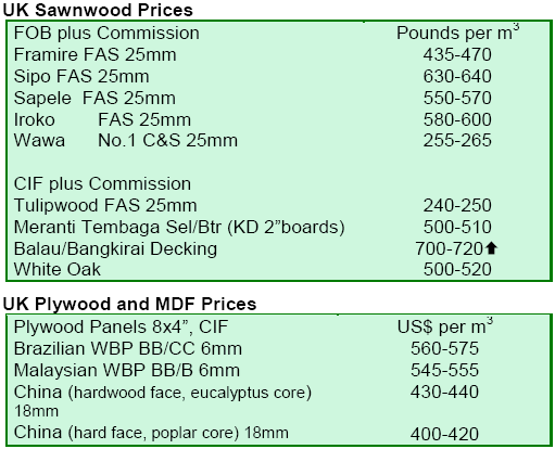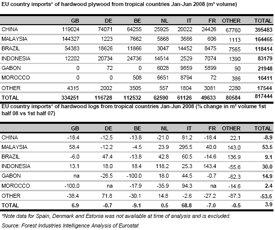 Imports of hardwood plywood into the 22 EU countries from tropical countries reached 817,000 m³ during the opening six months of 2008, around 4% up on the same period in 2007. After a slow start to the year, EU hardwood plywood imports picked up in the second quarter of 2008, particularly into the UK. However the data suggests that EU imports of hardwood faced plywood from China, which increased dramatically during the 2006-2007 period, may have hit a ceiling. Anecdotal reports of mounting supply problems are reflected in a 9% drop in EU imports of hardwood plywood from China in the first six months of 2008 compared to the same period in 2007. Meanwhile EU imports from Malaysia have increased sharply, up over 50% during the first half of 2008 compared to the same period of 2007. There has also been a partial recovery in EU hardwood plywood imports from Indonesia this year.