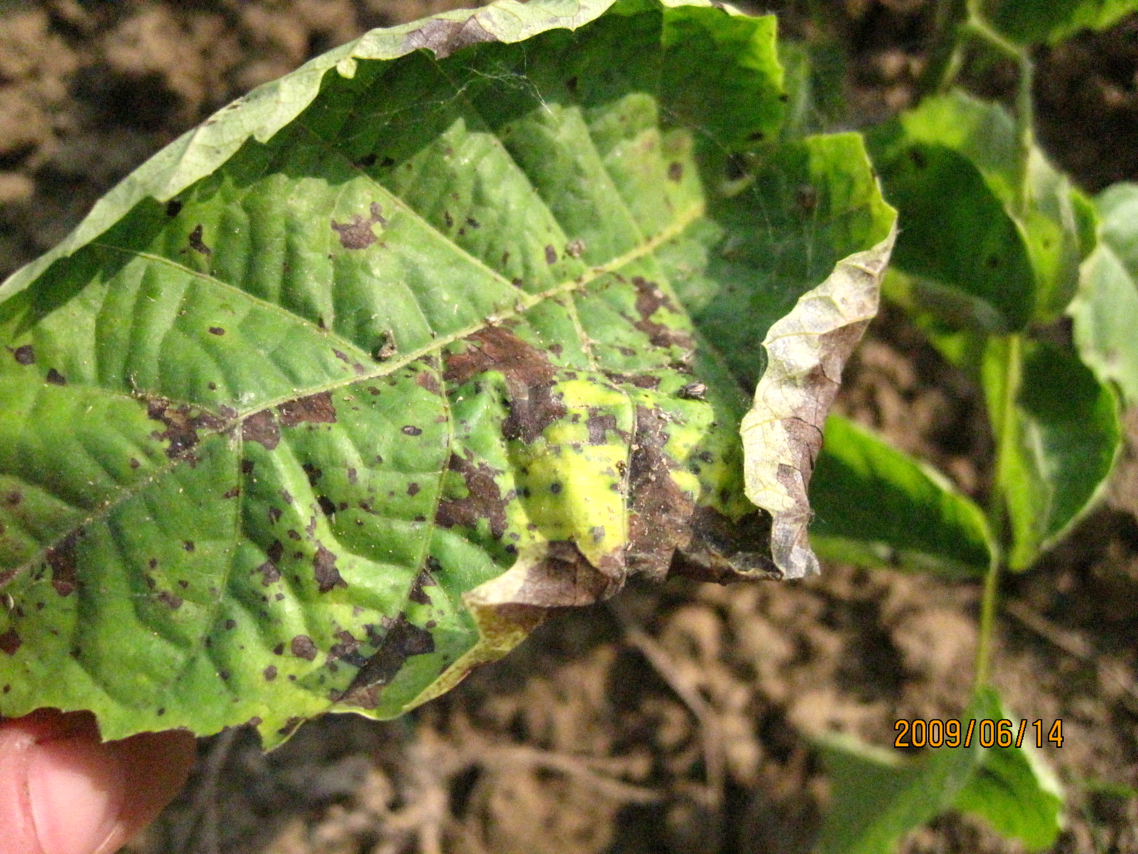 3、核桃黑斑病。细菌性病害,主要为害幼果和叶片。幼果受害后,果面发生褐色小斑点,渐扩大成片变黑,并深入果肉,整个果实变黑腐烂脱落。叶片受害后,叶脉上出现近圆形及多角形小褐斑,病斑外围有水渍状晕圈,少数后期出现穿孔现象。开花展叶期感病,夏季多雨发病重。与核桃举肢蛾害虫传带病菌有关。因而,首先喷施菊酯类农药预防核桃举肢蛾蛀食幼果。其次,喷施72%农用连霉素3000倍或20%噻菌铜500倍或23%络氨铜300倍防治。