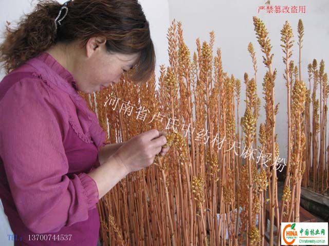 3.授粉:5月下旬天麻陆续开花结果。不授粉的天麻果其麻面没有生命力。天麻花粉在自然条件下难于自花授粉,仅靠昆虫传媒,授粉率极低,结果率不高。培育天麻种子,必须进行人工授粉。其方法是:麻果饱满硕大后,用细牙签挑开花苞和里面的子房,将柱头上花粉放到异株花的花柱上。然后,挂牌标记。18天后即可采摘播种。时间过久,麻角也会失去生命力。