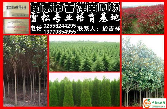 南京吉祥雪松苗圃场》专业雪松苗木种植基地!现有大量绿化苗木销售,主要品种有:雪松、蜀桧、广玉兰、紫玉兰、红叶李、高杆女贞、黄杨、棕榈、红枫、银杏、马褂木、香樟、桂花、紫微、金叶女贞、红叶小檗、石楠以及各种球类等几十个品种。苗木远销全国各地,深受广大客户的好评。在激烈的市场竟争中,我场将以新的企业形象、新的商业姿态、新的销售模式恭迎您的光临。本场苗木自产直销、量大优惠,送货上门。质量第一、信誉第一、价格最低。我场承诺:同等质量给您最低价格,同等价格给您最满意的质量与服务。欢迎各地新老客户来人来电洽谈订购。电话:13770854955.025-58244295 联系人:於吉祥,详情点击:http://www.xuesongmp.com