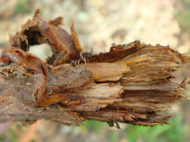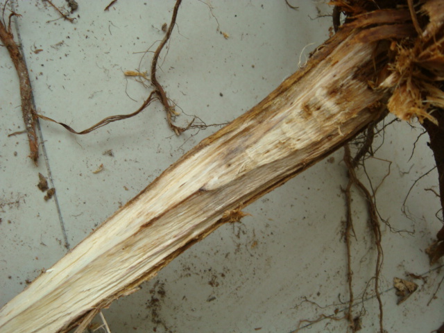 将病根、茎横切面浸入清水中,可使清水变成乳白色,如将清水滴在横切面上,1-2分钟后,切面的木质部即出现白色到淡黄色的细菌脓液,有时呈环状溢出,这一特征是诊断青枯病的重要依据。