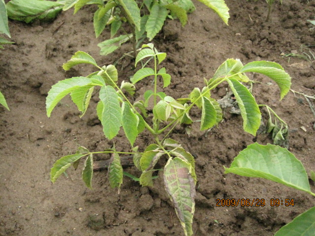 6.2 发病规律:病菌以菌丝或分生孢子器在病枝上越冬。翌春树液流动时,病菌孢子借风、雨、昆虫传播,从伤口侵入。可在芽痕、皮孔、剪口、嫁接口及冻伤、日灼处发生病斑。病斑扩展及病菌活动以4月中旬到5月下旬为主要时期,8月份出现第二次发病高峰,11月上中旬停止活动。一般土壤瘠薄,排水不良,管理粗放,遭受冻害和干旱失水的核桃树易发病。